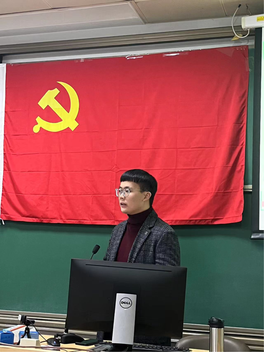 徐鸣威同学带领大家深入学习二十大精神。他首先分析了二十大召开的国际背景及国内情况,然后分部分对二十大报告的内容结构进行了细致的分析与阐述。最后,他鼓励同志们作为青年党员,要更加紧密地团结在党中央周围,青春向党,勇毅前行。