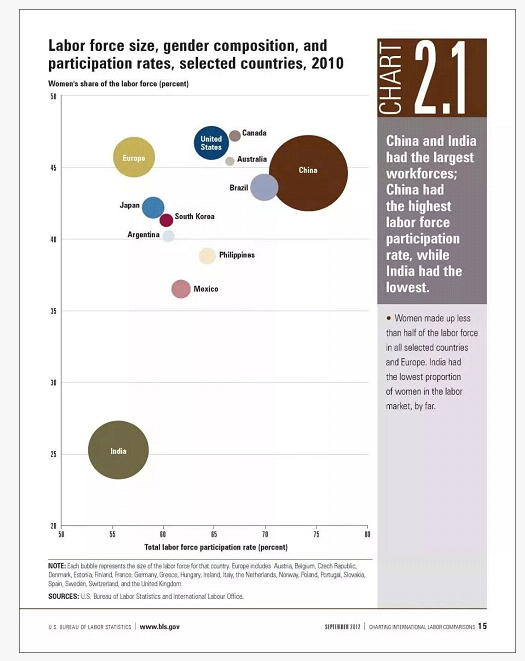 图7 2010年相关国家的劳动力规模、性别组成与参与比例