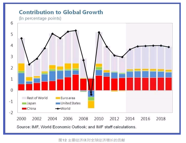 图12所示,单单就拉动世界经济脱离2009年之后的衰退而言,中国发挥的作用非常大。中国对全世界经济增长贡献度,至少是将近1/3,有的时候更大,已经超过美国很多。所以当下世界经济的火车头是谁?是中国与新兴经济体。整个新兴市场国家合在一起为全世界经济增长贡献70%以上的份额,美国不到20%,大概是在17%、18%左右。