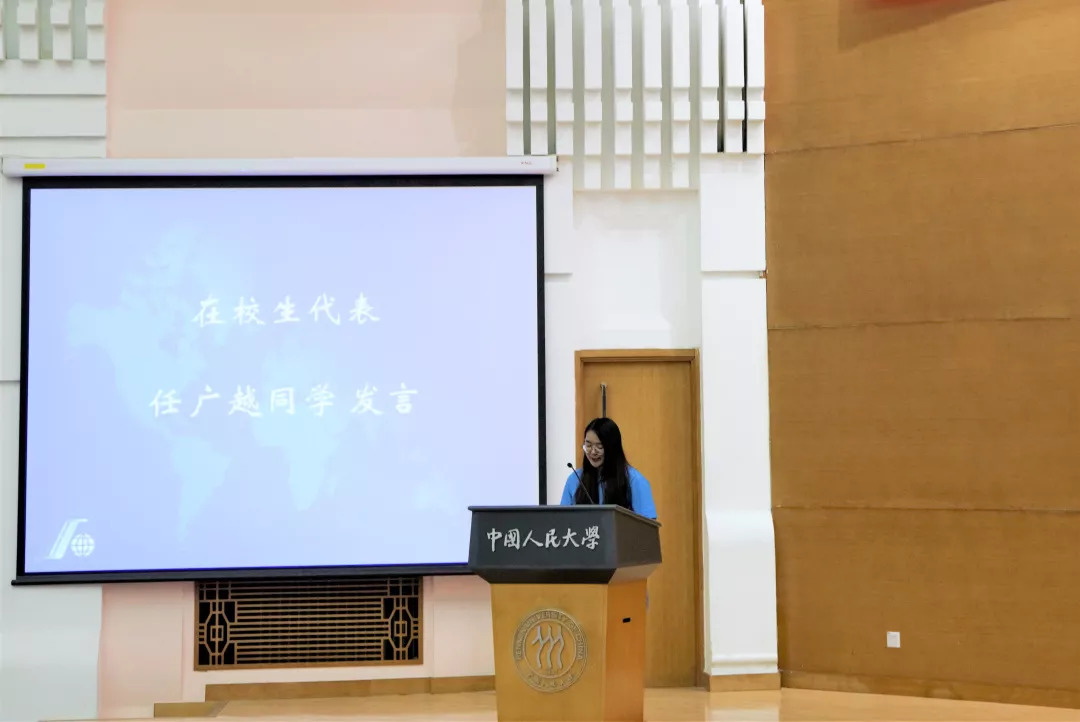 在校生代表,2015级外交学专业本科生任广越代表在校生发言欢迎2018级新同学。程千翔同学、郎简阁同学、韩国留学生李钟旻同学、于云方先生分别代表本科新生、研究生新生、国际留学生、新生家长依次发言。