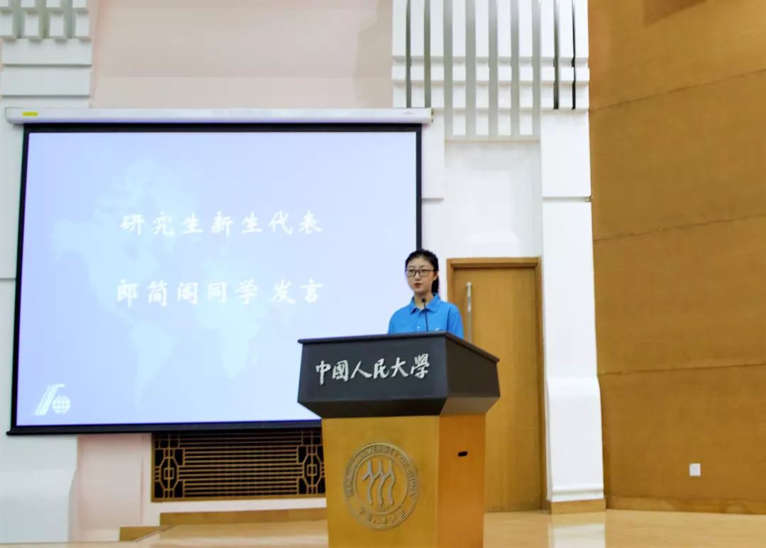 学院青年教师代表李晨博士致辞。李晨老师首先对本硕博新生表示祝贺。他表示,人大国关这个平台给我们带来信心与力量,让我们获得广泛尊重。李晨老师要求本科生与研究生的同学要厚积薄发,建立一套相应领域的专业知识体系;同时,他也提出留学生要融入课堂,要积极交流、碰撞思想。
